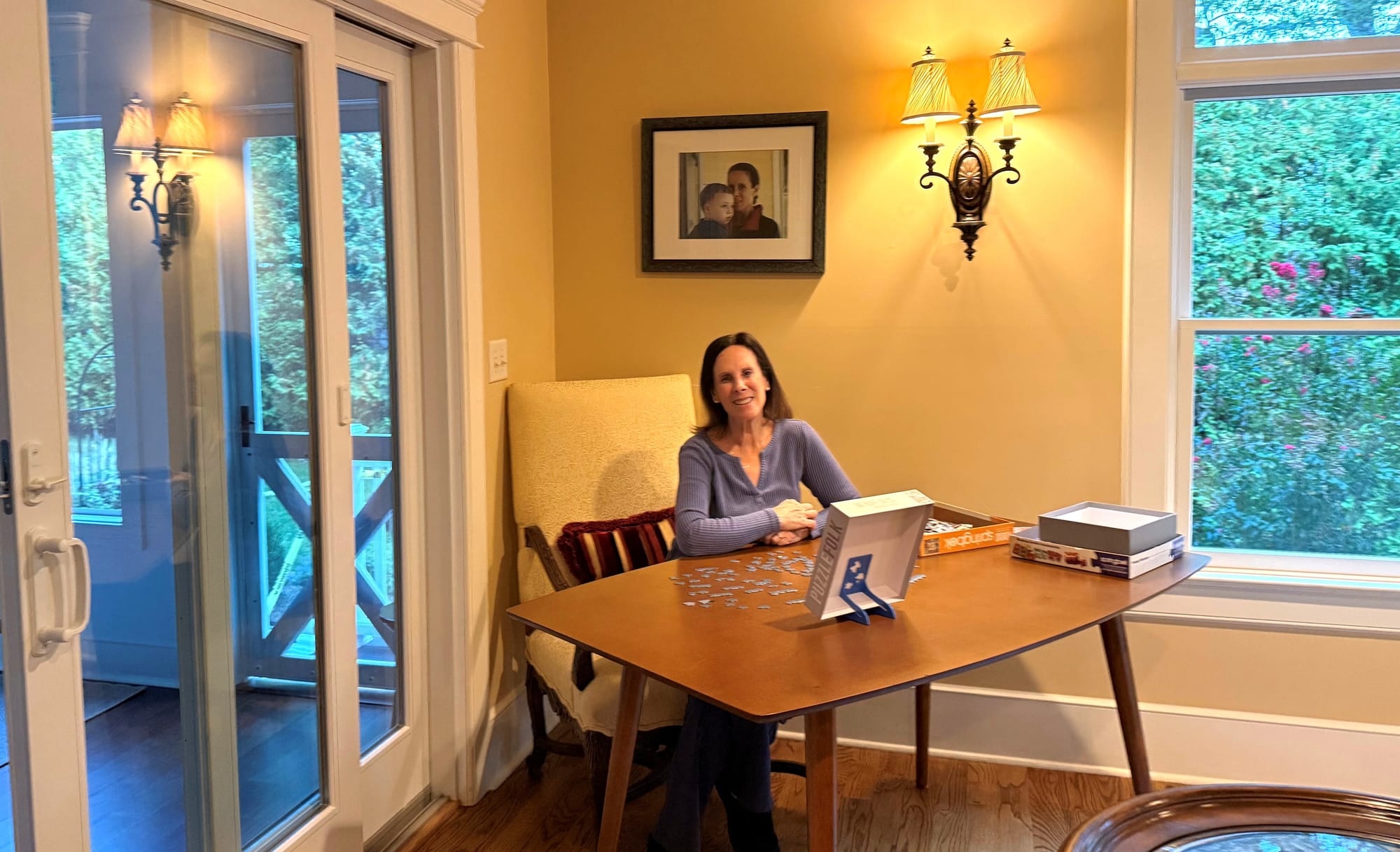 Nena puzzles wherever she can in her home. A permanent large table lives in her family room, and she often works on puzzling during TV shows she doesn’t want to just sit through, describing it as relaxing and effortless fun. It isn’t about perfection or productivity. “I love that there’s no real purpose. It’s only for fun and relaxing. I am not really getting anything ‘done’!” she says.